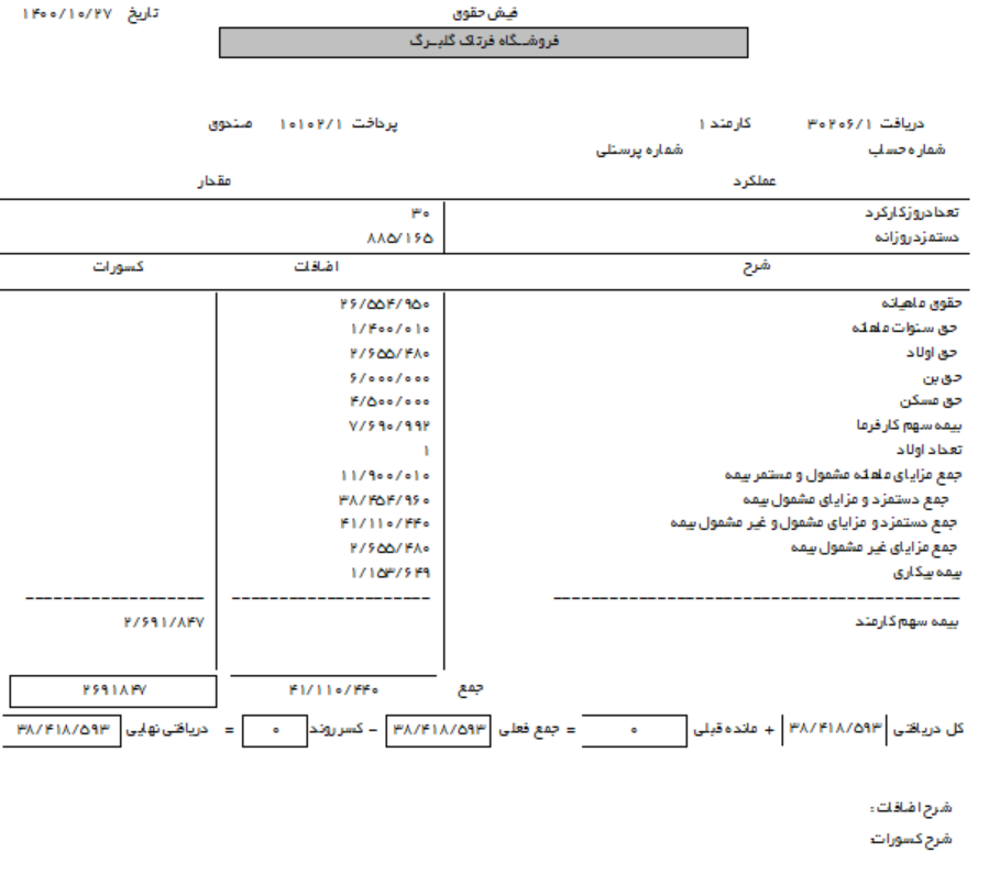 برخی از اطلاعات مربوط به حقوق و دستمزد شامل، مدت کارکرد، حقوق پایه، اضافه کاری، حق نوبتکاری، مرخصی استحقاقی، پاداش، کارآموزی، اوقات تلف شده، طرح های تشویقی، حق بیمه های اجتماعی،بیمه سهم کارفرما و…