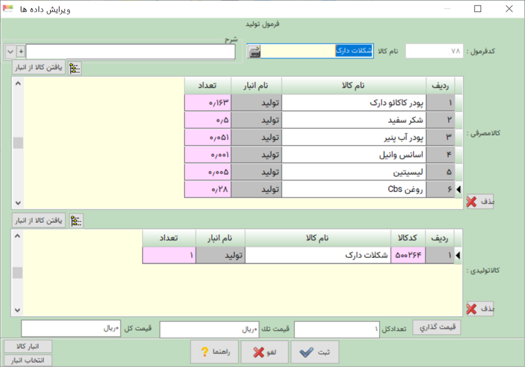 یکی از مهمترین قسمت های بخش تولیدی ، محاسبه ی بهای تمام شده ی کالای تولیدی می باشد ، در نرم افزار تولیدی حاسب بهای تمام شده کالا ، با توجه به قیمتهای خرید ، قیمت های موجودی اولیه کالا، حوالجات و… محاسبه می گردد.